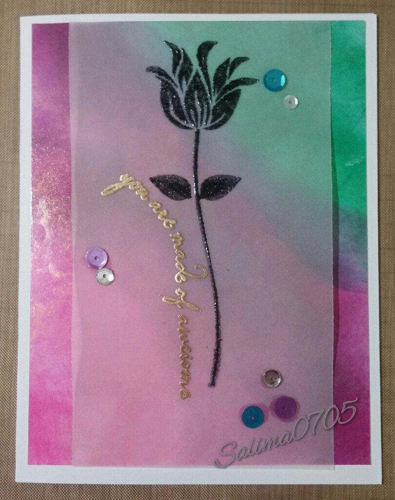 Because I could not just make 1 card For this card I wanted to get my hands a little dirty. Every time I buy ink for my HP printer I usually get all of this photo paper with the bundle. It is cheaper but then I never know what to do with the paper. I do not print my photos, i just upload them to Facebook or Dropbox (haha). I got an idea! I used my Distress inks in Picked Raspberry, Seedless Preserves and Evergreen Bough on actual photo paper. After I colored my paper, and my hands, I then spritzed the paper with Pearl Ex Powder in Aztec Gold (from Stampin Up- not sure if they still sell it) mixed with alcohol since it would dry faster. Used my heat tool to dry it up a little. I then stamped The Tulip Stem stamp from So Suzy Stamps in Memento Tuxedo Black ink on to Vellum. I added clear embossing powder and heat embossed to make a little bit of a distressed look. Nice thing about clear stamps is that you can bend them in any way. The sentiment is from Altenew’s Lace Up stamp set. I just bend it a little on my clear block to sort of fit the side of the stem of the flower. Inked up the sentiment with Versamark and then heat embossed in Queens Gold powder by Ranger. The Vellum was then glued to the photo paper which was then adhered to white card stock base. Added a few sequins and I am happy. The card has a little bit of shimmer with the colored background. Hope you like the card. Share this: Click to share on X (Opens in new window) X Click to share on Facebook (Opens in new window) Facebook Click to share on Pinterest (Opens in new window) Pinterest More Click to email a link to a friend (Opens in new window) Email Like Loading...