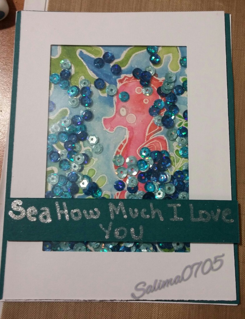 As soon as I received this Sea Horse stamp from So Suzy Stamps, I had to water-color him.  I used water-color paper 5 1/4 in by 4 in and stamped the Sea Horse, Sea Plant and Coral in Versamark and then heat embossed it in white. My Kuretake Gansai Tambi water-color set came in handy next.  I love to water-color.  Not sure why it calls to me…. I filled in the entire background with lots of color. Once it was dry I spritzed the background with some Champagne MIst All Purpose Ink mixed with alcohol.  Of course this is a shaker card and I found sequins from Hobby Lobby that reminded me of the ocean in 4 shades of blue , were sparkly too.  Broke out my fusing tool from Project Life to make the shaker part of the card. Found thick photo sleeves in that had 4 X 6 sized sleeves in them made by WR Memory Keepers,bought from Tuesday Morning.  Used my Lil Inker Designs Square Dies (the third largest) to cut out the front card stock.  Adhered everything with Scor-Tape to Aqua card stock and then to white card base.  Loving how the sequins move so freely in the shaker card.  Thank you for tuning in! Cannot wait to create again!