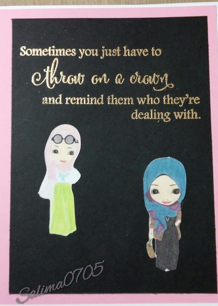 So Suzy Stamps has a new challenge for the best snark in a greeting card. I am up for this challenge. For my first card, I have a beautiful sister who sent me these beautiful little girls in a Pocket Letter. When I received this stamp from So Suzy Stamps, I knew that I needed to make sure a girl with hijab ( the Muslim woman’s head covering) to explain the crown. I feel my hijab is my crown because it empowers me more so than when I did not wear it. The hijab has given me strength beyond my belief. The sentiment was heat embossed in gold embossing powder on black card stock measuring 4 in by 5 in and then the little hijabis (women who wear the hijab) were glued on with confidence which is shown on their faces and is apparent in the sentiment. The black card stock was added to pink card stock measuring 4 1/8 inches to 5 1/4 inches and then added to a white A2 card.
