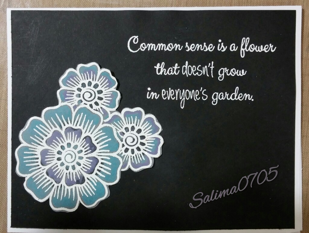 And then I just could not make one card with snark because I was feeling a bit snarky since I turned 45 on this day. For the second card I heat embossed in white on vellum and then turned the flowers from Altenew’s Henna Elements stamp set and colored them in with colored pencils in aqua and purple. I then fussy cut them out. The sentiment is from So Suzy Stamps snark collection. I heat embossed this on black card stock measuring 4 1/8 by 5 1/4 inches with white embossing powder. The flowers were glued on in the corner and this was attached to a regular A2 measuring card stock in white.