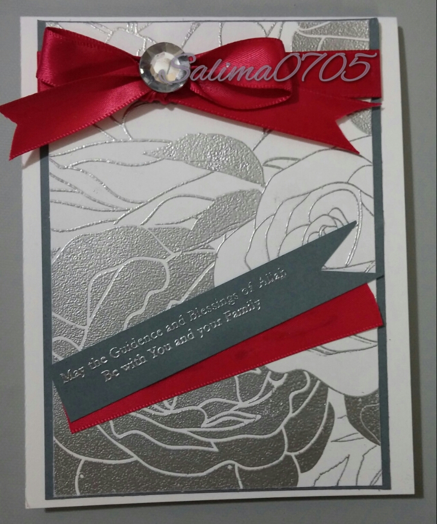 The card I did submit for the November Mail Call is White on Gray/Silver with a pop of Pink color. I took a piece of Bazzill Marshmallow card stock and stamped The Ton’s Rose Background stamp in Versamark and heat embossed it in Ranger silver embossing powder. I cut this piece to be 3.5 in by 5 in. I added this to gray card stock cut slightly larger, added a pink ribbon with bow and attached this to a Bazzill Marshmallow top folding A2 card base. I heat embossed a sentiment from Altenew’s Eid Greeting stamp set wishing Allah’s blessings and guidance on her and her family in the same silver embossing powder. Allah is just another name for God. This sentiment was cut out to be a banner and attached to a sliver of the same pink ribbon underneath it. A large round jewel was attached to the top of the bow.