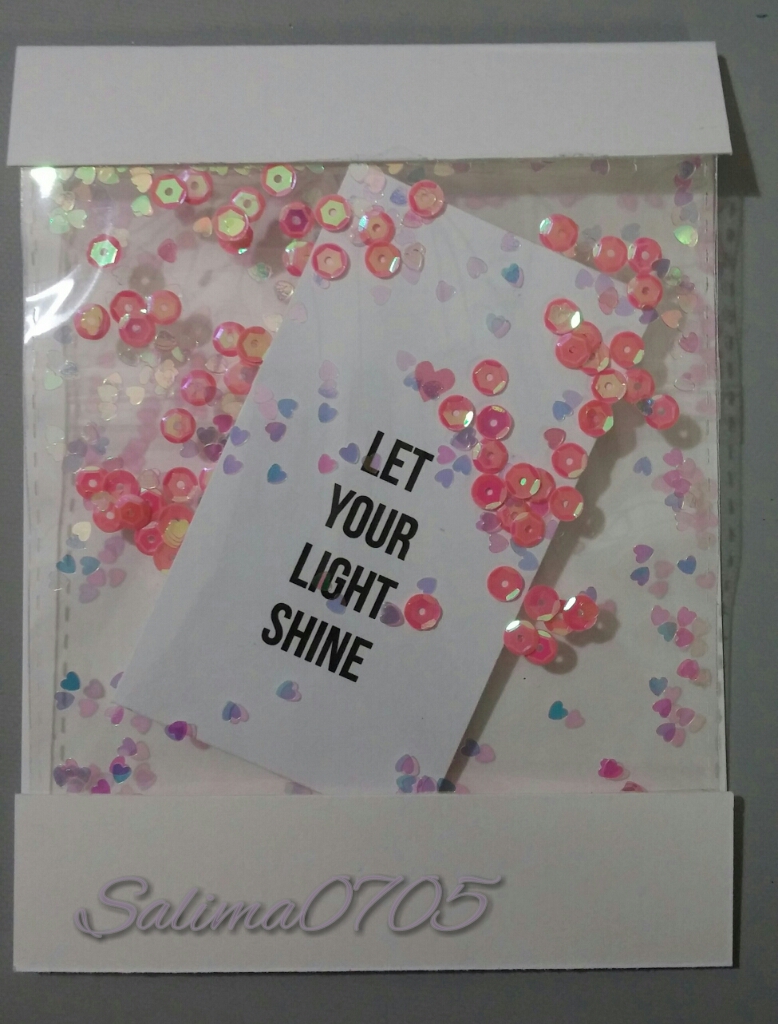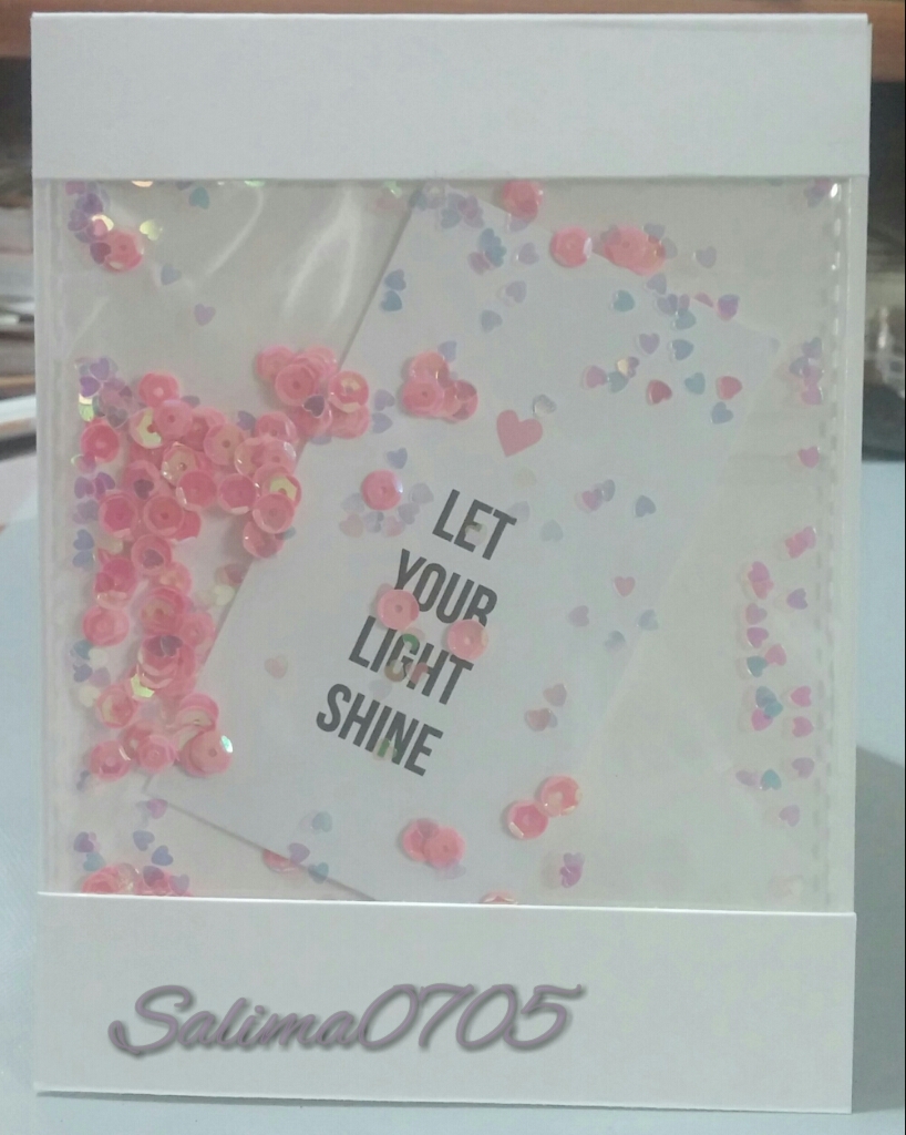 As in my previous blog, I mentioned that I stayed up waaaayyy past my bedtime because I was so inspired. This next card was inspired by three beautiful, creative people. I had always wanted to be a part of Kristina Werner’s Mail Call. November is her month where she has asked for an all white or a holiday themed card. Ruby Naz had mentioned in her blog that she received these beautiful inspiring quote cards from Melissa Brickard and she had made a shaker card with one of them. Lastly Jennifer McGuire had made a clear pocket shaker card. What I came up with was quite exquisite.