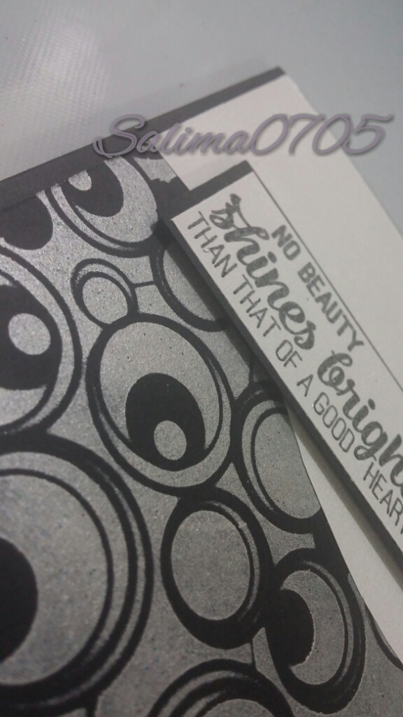 For my last card, I wanted to use a stencil. I went to Tuesday Morning yesterday and found some Spellbinders Impressabilities and used the Circles Stencil. I took some black card stock and a ink blending tool I added Brilliance pigment ink in Platinum Planet. I added a platinum colored shimmer paper to the top of the card ( I cut a swervy line at he bottom of it) to the top of the black. This focal piece was then attached to a side folding black A2 card base. The Ton’s Heart Diamond Stamp set has this beautiful sentiment that just pulled out to me. No Beauty Shines Brighter that That of a Good Heart. I stamped this in Memento Tuxedo Black Luxe ink and heat embossed this in clear embossing powder. This sentiment was matted on black card stock and attached with pop up squares. To finish off the card I used some enamel dots in the same platinum color on the top right corner.