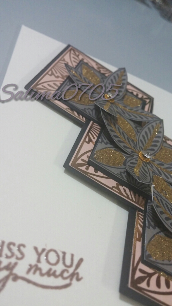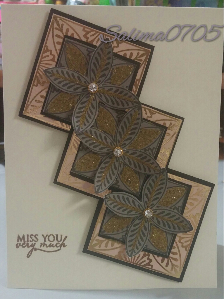 I just couldn’t resist. Had to make one last card. For this card I loved the geometric shapes on My Mind’s Eye Fancy That 6×6 paper pack. It is truly a gorgeous pack of beautiful paper. I got to first play with it when I received the monthly card kit from Simon Says Stamp back in May of this year. I cut out each individual square by hand, which when I finally get my Brother Scan N Cut 2 I will no longer have to. I I layered the gray colored paper on top of the pink colored one. The gray colored one had a little flower petal like print on the inside of the square so I cut them out also. I layered that on top. I then applied glue with my glue pen and allowed the glue to dry a little. Once I could not see the blue color any more I added Ultra fine gold glitter. I attached this to the front with pop up squares of a top folding A2 card stock in Stampin Up’s Very Vanilla and on the bottom left corner used Altenew’s Lace Up stamp set for the Miss You Very Much sentiment. Simple card but says so very much….