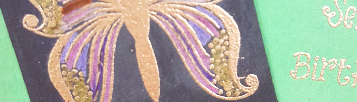 For my second card, I decided to use the butterfly and stamp this on black card stock in Versamark. I heat embossed this in Antique Gold from Ranger. I then used my Artist Colored Pencil set to color in the wings. I attached this to lime green card stock and heat embossed the sentiment from So Suzy Stamps in the same Antique Gold. I attached this to some patterned paper a little catty-whompas. This was then attached to a white A2 card base.