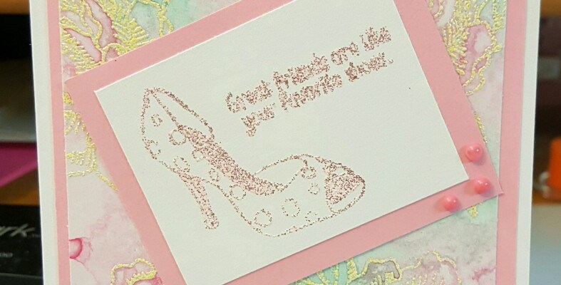 I have created this card because I have such great friends and this stamp set made me remember each and every one of them. The background was made with the Rose stamp from So Suzy Stamps and heat embossed in Brutus Monroe’s Spring Sparkle Embossing Powder. Then I used Ken Oliver’s Liquid Metals in Metallic Rose and Jade. I added them in separate spritzer bottles with a little bit of water and sprayed the paper in random places with the two different colors. The stamped image is from Skipping Stones Designs called Sassy Shoes. This was heat embossed in pink glitter embossing powder. The inside sentiment is from the same stamp set in black onyx from Gina K Designs. Nuvo Crystal Drops added as an accent in Carnation Pink.
