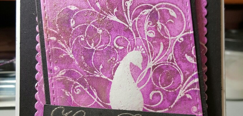 Everyone knows how much I love glitter. Just to commemorate my love for bling, I made 2 cards. For my first card I used I inch double-sided adhesive tape. I used Nuvo Pure Sheen Glitter in Butter Diamond and Glitter Candy Pink on black card stock. I first added he Butter Diamond and then cleaned off the excess. Next I use the Candy Pink and cleaned off the excess. Sentiment and Mermaid stamps are from So Suzy Stamps. I won these exclusive stamps in an exasperating challenge. Mermaid was colored with Stampin Up markers and cut out. Added to a white A2 card base. The sentiment is a beautiful message for someone who needs a little lift up. For my next card I used one of my favorite stamps from So Suzy Stamps. His name is Phineas the Peacock. The swirls of the peacock are what appealed to me at first look. I heat embossed Phineas in clear on white card stock. I then used my new passion to color the background. Ken Oliver’s Liquid Metals. I used the Metallic Amethyst, Copper and Metallic Rose. Just added a few drops of each to the and then used a mini spritzer to spray on some plain water. A blingy, purply background was my end result. I used the dies I purchased from Catherine Pooler’s A Beautiful World Stamp of Approval Collection. Phineas is elevated just a bit by using black colored fun foam. The Happy Birthday script is also a stamp from So Suzy Stamps. This was heat embossed in silver. All attached to black card stock and then to a white A2 card base. Hope you like my cards. You may need shades to look at them, just beware… Hehe