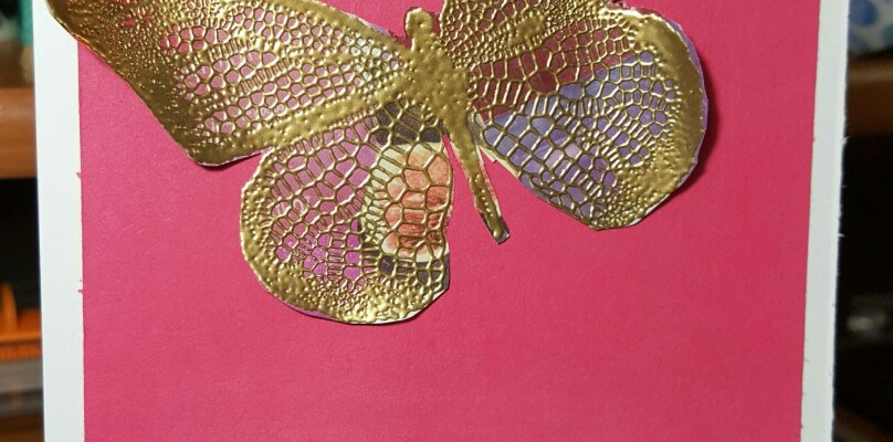 It is amazing how much one can learn when surfing YouTube. I started watching and fell upon this cool technique. It is called Faux Cloisonne. The items you will need for this is a magazine page, gold or silver embossing powder, Versamark pad, heating tool, embossing buddy and of course the stamp that you want to use. The image you use should have some solid parts bur some open parts also. I used the Butterfly stamp from So Suzy Stamps and don’t tell anyone but my Avon catalog. I heat embossed it in gold and fussy cut around the edges. I then just added it to a card front along with a gold heat embossed Birthday sentiment which I also purchased from So Suzy Stamps. Check out the card and let me know what you think…