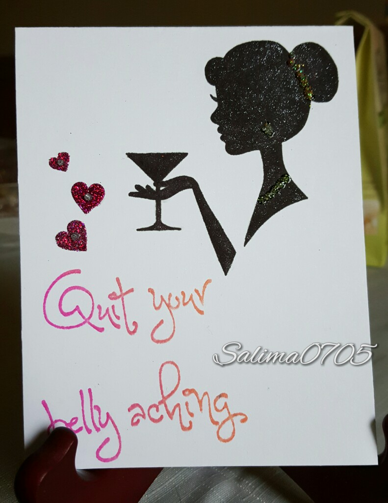 Have you ever wanted to tell someone to just get out of their funk and stop bringing every one around them down? Well I have the perfect way to do so….. Quit your belly aching…. Enjoy this beautiful clean and simple card. Silhouette stamp purchased from So Suzy Stamps was stamped in Gina K’s onyx black. Quit Your Belly Aching stamp stamped in Reflections Ombre Ink Pad. Heart Stick Ems dipped in Nuvo Pure Sheen glitter and attached to the from of the card. Nuvo Crystal Drops used to add bling to the silhouette’s bun, ear and neckline and to the middle of the hearts. Of course that was not enough bling for me…. I used my Spectrum Noir Sparkle Pen to the silhouette and writing. A simple but meaningful card for that one person in your life that you want to say get over it to… a little sophistication to go with your smartassedness… is that even a word?? Link below is how you can attain this silhouette to be a part of your collection. The Quit Your Belly Aching stamp was a custom made stamp from So Suzy Stamps upon my request.