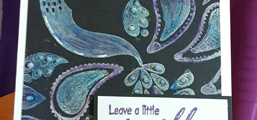 Black Magic…..I have not utilized this technique in such a long time. It is elegant in its own right. When I saw a Stampin Up demonstrator write about it in her blog, I knew I had to try again. And I also knew the perfect stamp set.. Catherine Pooler’s new Paisley Peacock. For this card I used Tsukineko’s Brilliance Dew Drop in Moonlight White and stamped all over on black card stock. I used my heat gun to dry the ink just in case so I did not smear it.