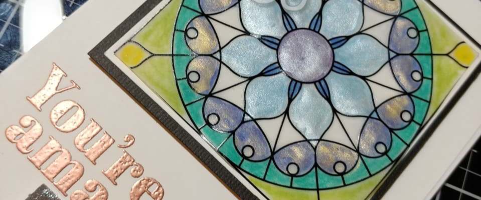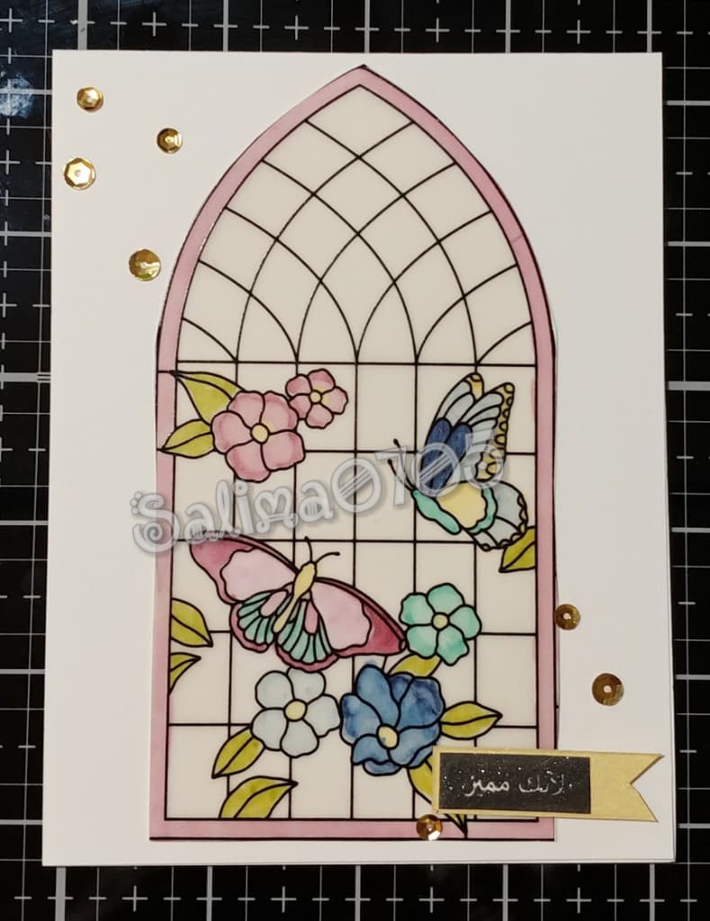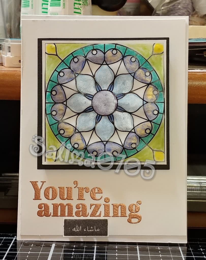 For my second card, I went to my “GO TO” sentiment, “Mashaa Allah”, from Altenew’s Label Love Arabic set. This card also is utilizing the sentiment “You’re Amazing” from Simon Says Stamp’s Thankful Flowers Stamp Set. Focal point is also from the Graceful Glass Designer Vellum pack. This one was colored with color pencils from behind to make the coloring subdued. From the front, I used gold water color to give some shine to the front of it. It was backed with some Whisper White and then black card stock. Sentiment from Simon Says Stamp was embossed in Penny embossing powder from Brutus Monroe. Sentiment from Altenew is stamped in amalgam ink from Gina K Designs.