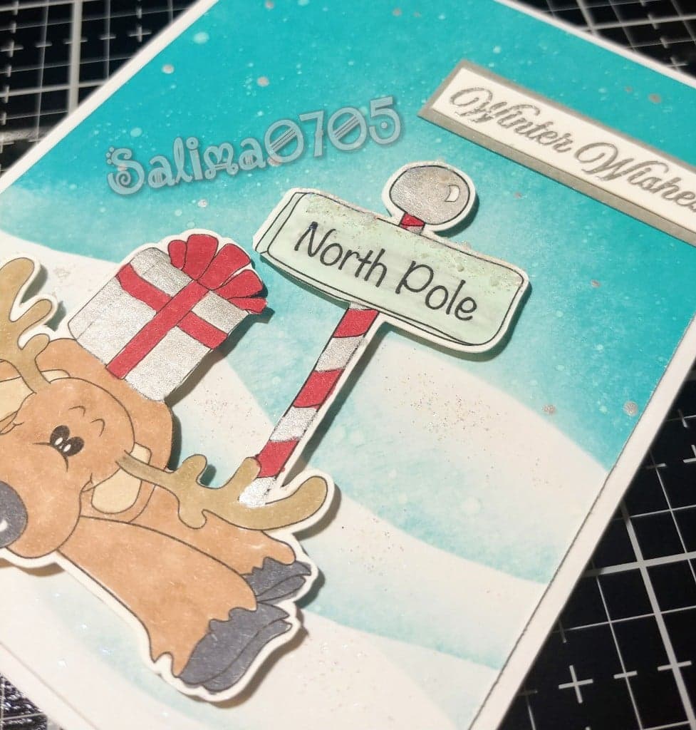 I printed him on Whisper White card stock from Stampin Up. Then used my SNC to cut him out. He was colored with Stampin Blends in the colors, Bronze, Light and Dark Crumb Cake, and Light Basic Black. I used Dark Cherry Cobbler on the ribbon on the present and the pole and light pool party on the sign. The rest of the present and parts of the pole were colored in Smooch pearlized ink in silver. The inked the background in Distress Oxide inks in Broken China, Mermaid Lagoon and Tumbled Glass. I used the Smooch and White ink to make snowflakes falling from the sky. The snowbanks were created by using scraps and cut out hills. I used a little Glitter Kiss in Frosty Sparkle to give the snowbanks a little shimmer. Also added a little to the sign. This cute little reindeer looks like he has fallen and all he can do is wish you. Winter Wishes sentiment from the November Paper Pumpkin from Stampin Up. It was stamped on Whisper White in Versamark and then Heat Embossed in Silver Stampin Emboss Powder.