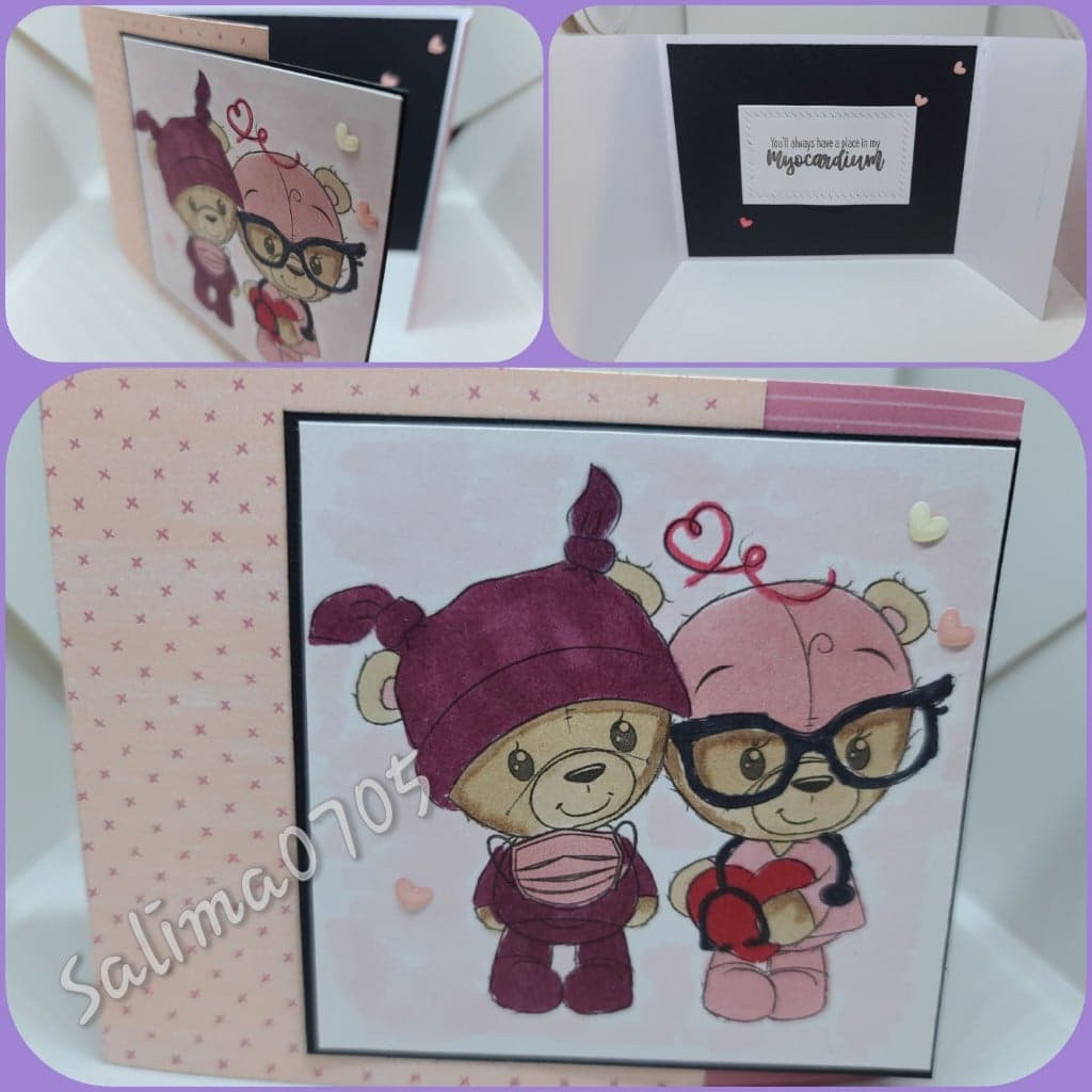 In adversity is when you are able to see the true colors of humanity show its beauty. All the wonderful workers that are out there risking everything to keep the world safe. Since I am a nurse, I, of course, have a special place in my heart for the medical professionals out there. Many stamp companies are offering free digital downloads to allow us to thank those beautiful workers. Such a company called Sassy & Crafty designed these cute little bears called Healing Heroes. Not to downplay all of the wonderful caring and selfless people out there protecting us. My version of this card was on a a side opening card which was pre-printed from my Stampin Up February 2020 Paper Pumpkin kit. I printed out the digi file and colored the bears with my Stampin Up Stampin Blends, layered on Basic Black card stock. I cut out the sentiment for the inside with stitched rectangle die centered on Basic Black for the inside. I had some left over enamel hearts from a previous Paper Pumpkin but I cannot remember when it was from. One thing about Paper Pumpkin is that you are able to make beautiful cards whether you use the kit as the directions or let your imagine run wild. If you are interested in learning more, please visit my page : https://salimachaudhry1.stampinup.net/. I will be more than willing to assist you in learning more about crafting beautiful cards and other projects.