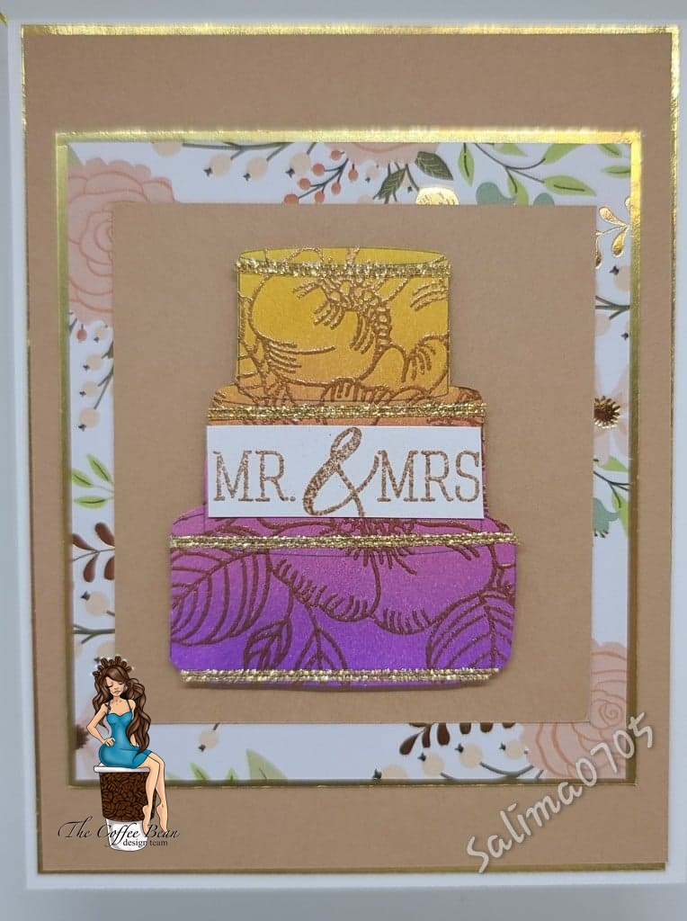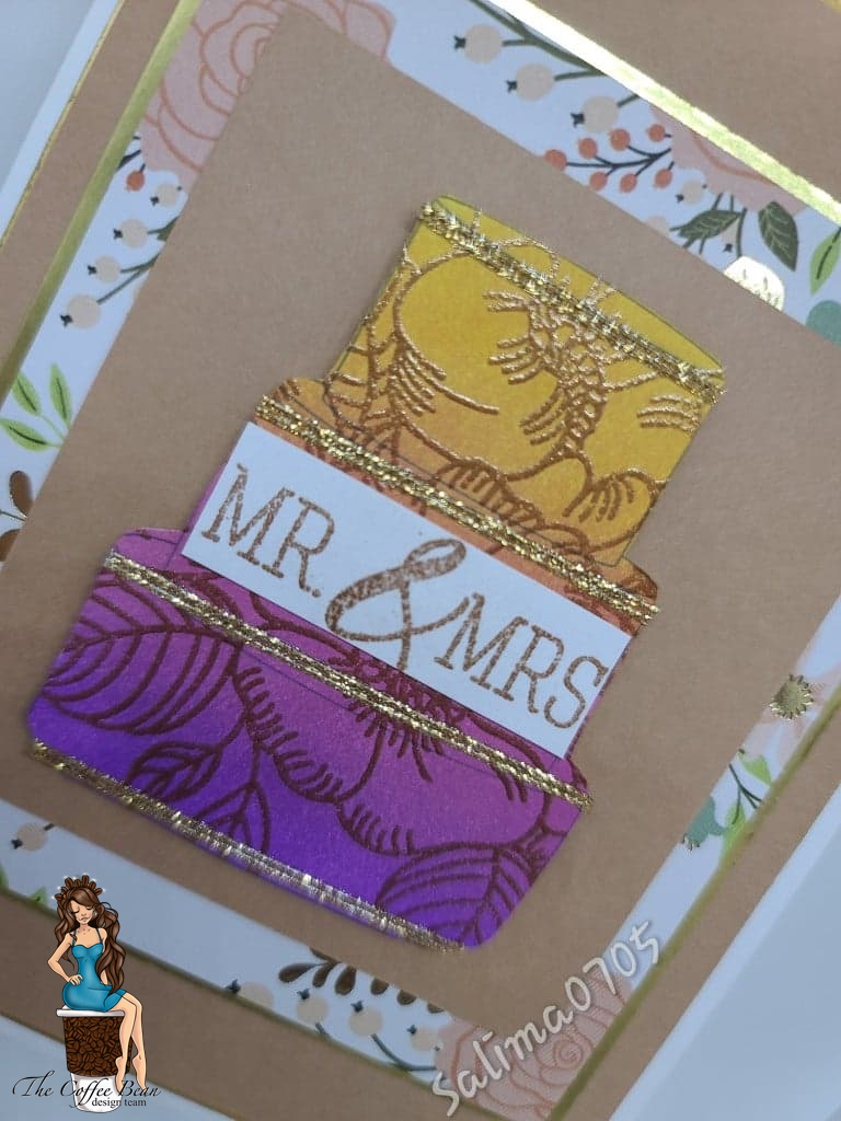 Salima here with a beautiful wedding card to give to that special couple this wedding season. The Digi file is from Annie Collins and was sponged with Tim Holtz Wilted Violet, Picked Raspberry and Wild Honey Distress Oxide inks. Large flower image from Simon Says Stamp’s Thankful Flowers stamp set heat embossed in Caramel Cosmic Semi Transparent embossing powder from Sparkle and Sprinkle as was sentiment which is from Simon Says Stamp’s Congratulations stamp set. Mats are Gold Mirror Card stock from Stampin Up, Peach colored card stock, and patterned paper from my old stock. Glitter Peel Off Stickers in gold from Love from Lizi. Enjoy this card. All tools used to make this card such as Stamparatus and Paper Trimmer from Stampin Up. I am a demonstrator for Stampin Up. If you are looking for a little help in starting to create or if you are an expert card maker, Stampin Up has something for everyone. Please contact me at: https://salimachaudhry1.stampinup.net/ for all of your creating needs.