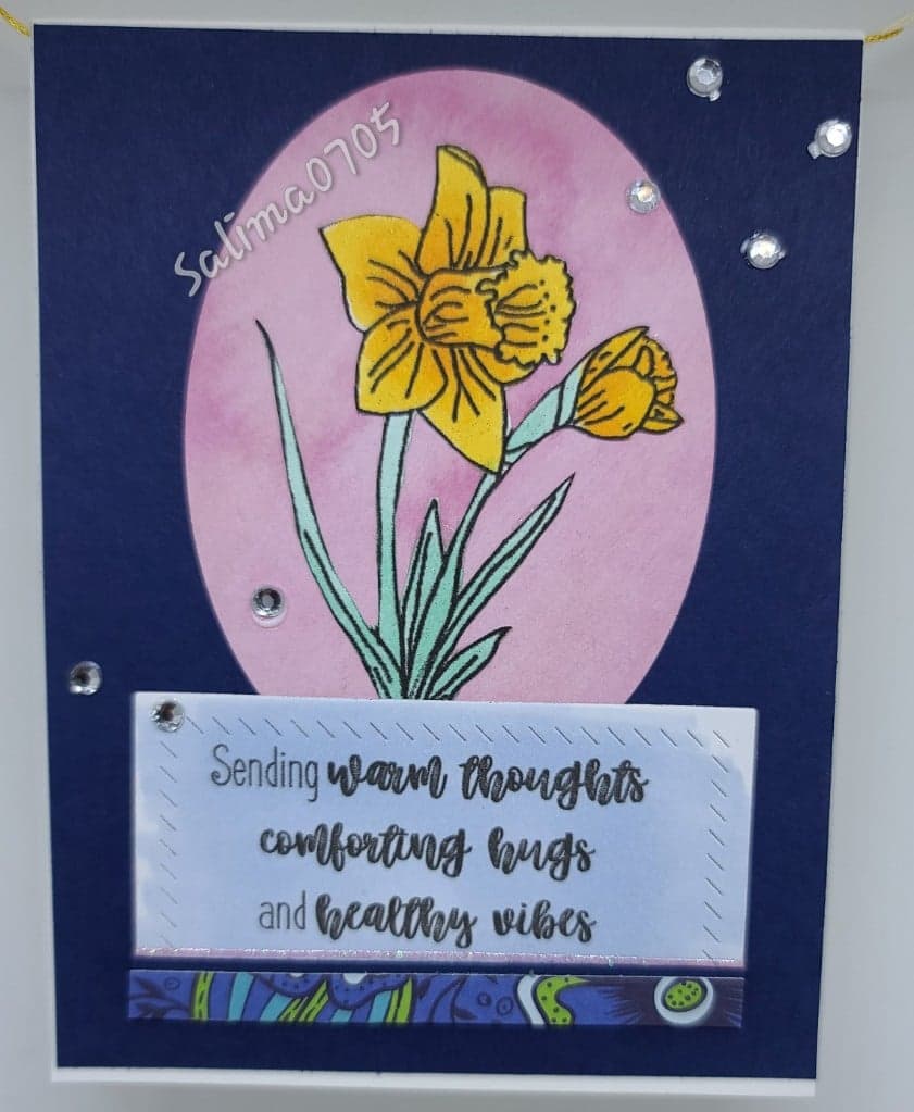 When someone you know is feeling a little blue and under the weather due to the current COVID situation, daffodils say, ” Hey, here is some positive energy to help you battle whatever you are going through.” he sentiment is from Sassy and Crafty Healing Heroes free digital printable. The Digi file for the daffodils can be found the Multi Crafter’s Cafe Facebook page.