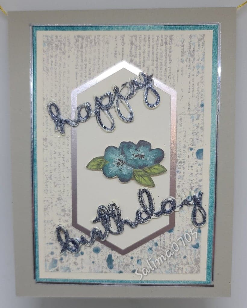 I was looking in my old Paper Pumpkin kits because I need to rearrange my craft room… Ha! As you can see I was very productive. Yes. Yes, I know. I got sidetracked. But look at what I made because of that distraction. The supplies are from the May 2019 Paper Pumpkin. They had little note cards in the kit which to cut up to make the top and second layer underneath the focal point on the front of the card. The blue paper under that was made by taking the ink pad direct to paper. I used my Island Indigo and made the same color card stock to match the flower and the designer paper. The card base is an A2 size card base. The “Happy Birthday” is from the Well Written Dies. I cut out 3 of them each to give them some dimension. I had used my glue pen to add glitter to the top layer on top of a layer, however the glitter did not stick as well as I would have liked it. Then on second thought, the missing areas of glitter looked a little rustic looking, I kept it that way. Flower is from the same Paper Pumpkin pack and raised on pop dots. I used glitter peel off stickers from Love from Lizzy around the blue card stock.